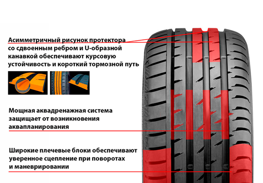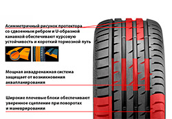 Безопасное поведение автомобиля на высоких скоростях обеспечивается за счет асимметричного протектора. Ребра жесткости сохраняют курсовую устойчивость и маневренность.
